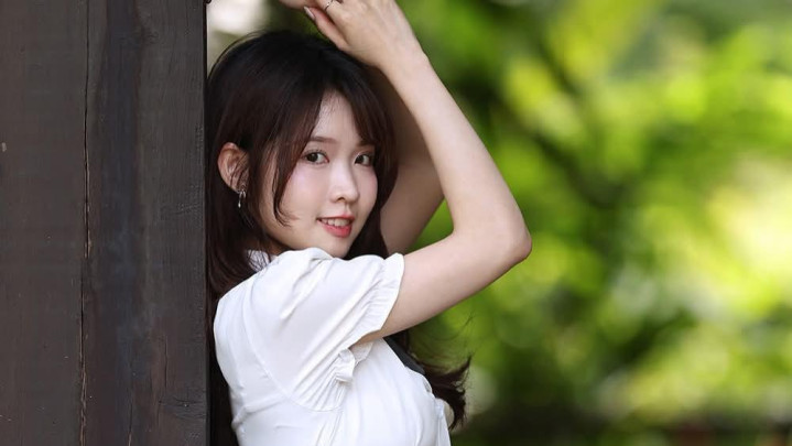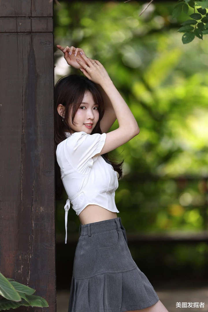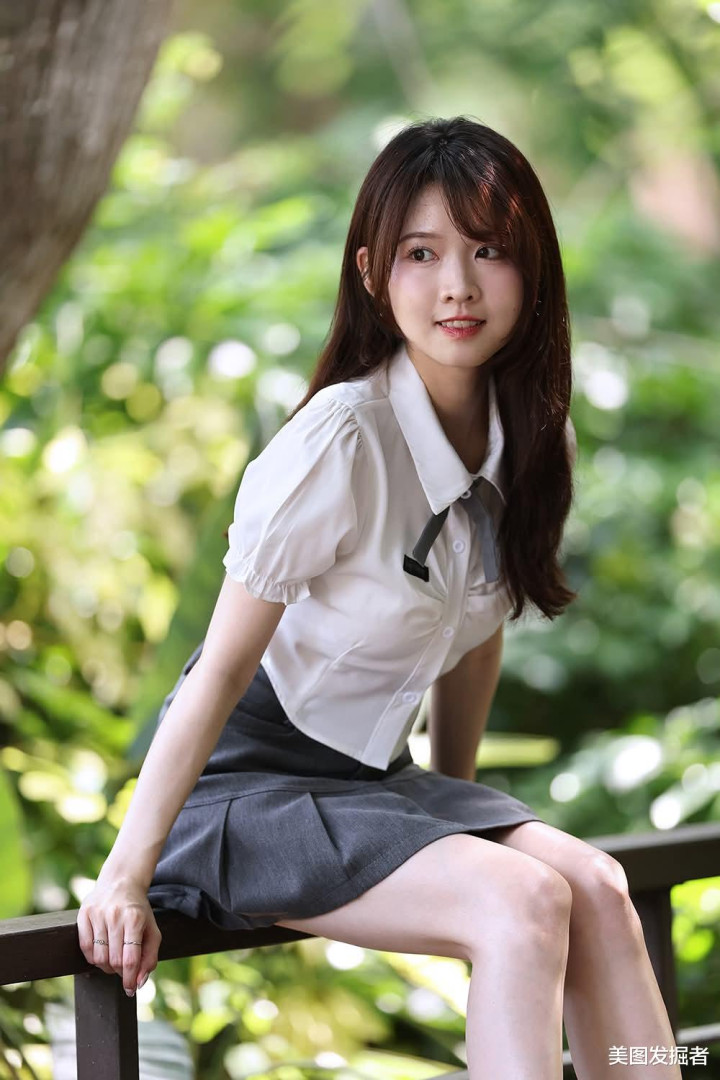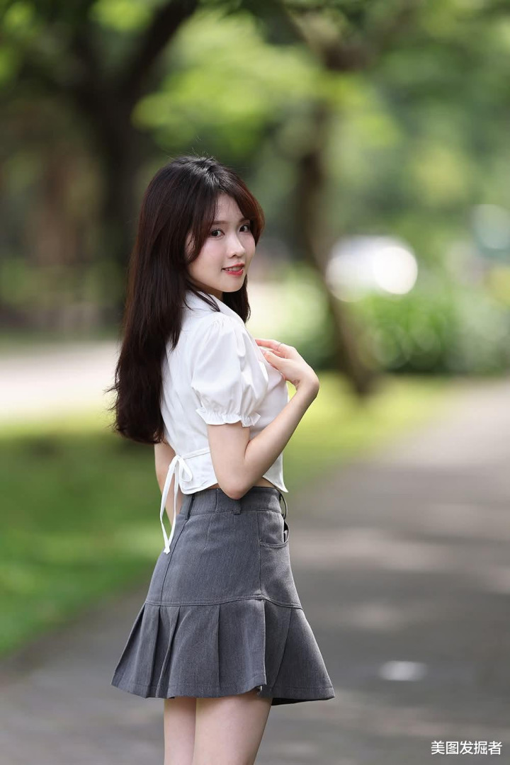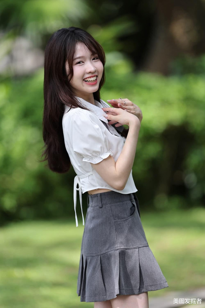 白色泡泡袖衬衫勾勒纤细肩颈线条,灰色高腰百褶裙轻盈展露修长美腿,黑色皮鞋与袜子的利落点缀,于绿意盎然间演绎灵动与优雅的平衡,尽显青春活力与精致时尚。